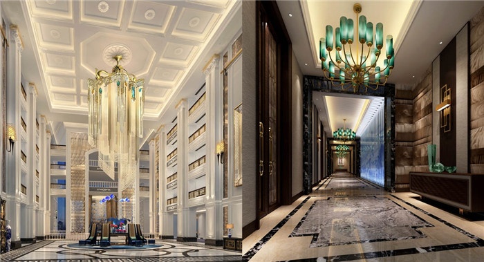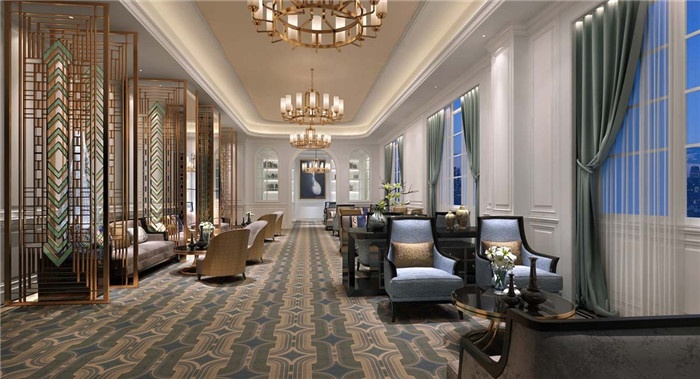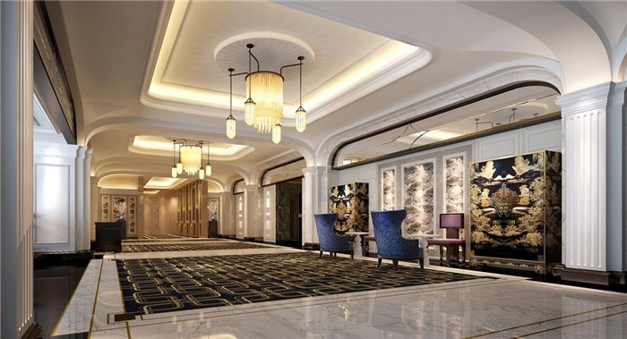 一個較大的酒店設計空間可利用天花的升降、地坪的高差,以及圍欄的、列柱、隔斷等進行多次元的空間分割。實體隔斷如墻體、玻璃罩等的垂直分割成私人密性比較強的酒店空間,隔透性隔斷,如各種形式的落地罩、花窗隔層,既享受了大空間的共融性,又擁有了自我呵護的小空間,列柱隔斷,可構成特殊的環境空間,似隔非隔,隔而不斷。燈飾區隔空間,利用燈飾結合天棚的落差來劃分空間,這種空間的組織手法,使整體空間具有開放性,顯得視野開闊,又能在人們心理上形成區域性的環境氛圍。